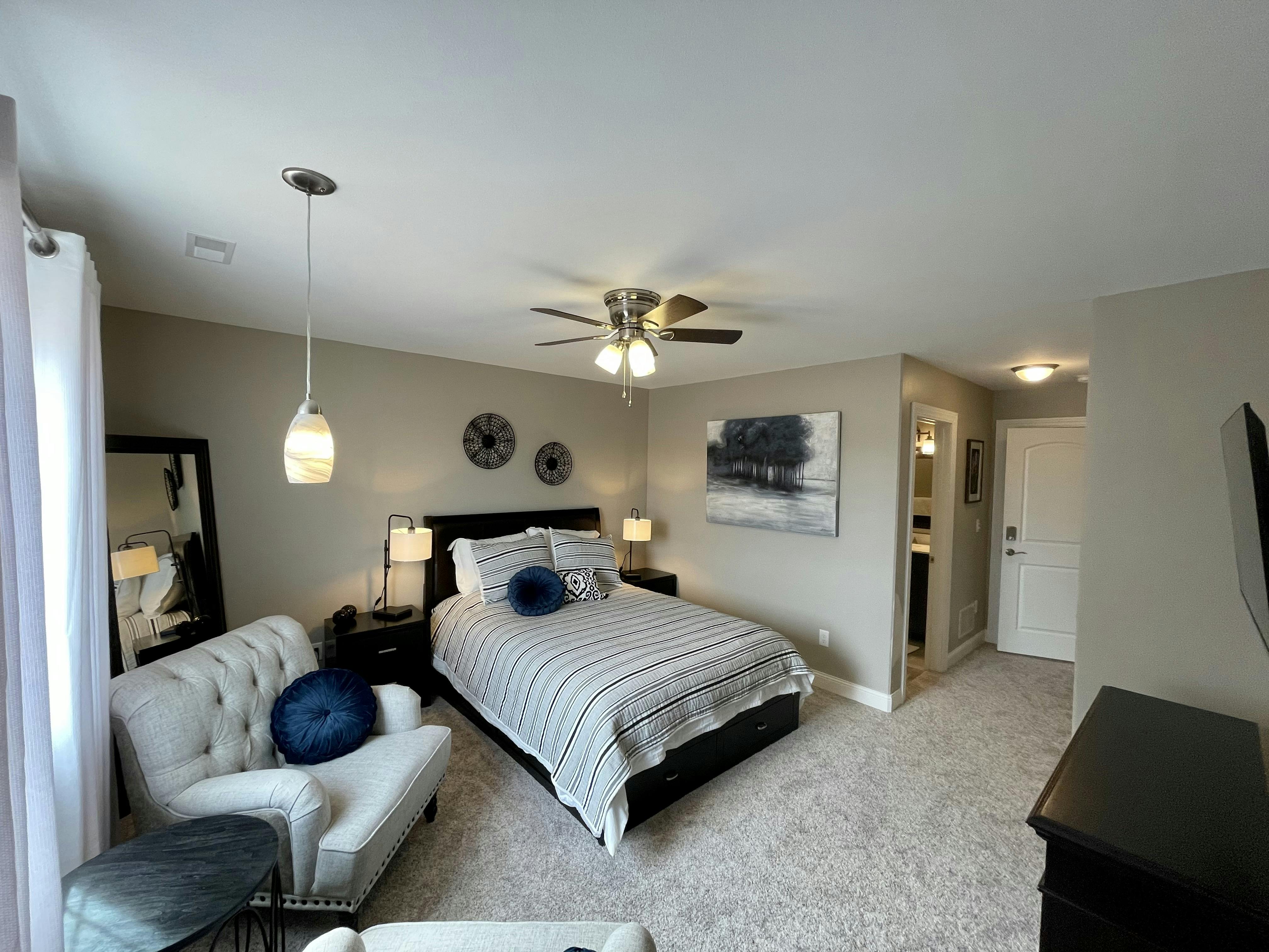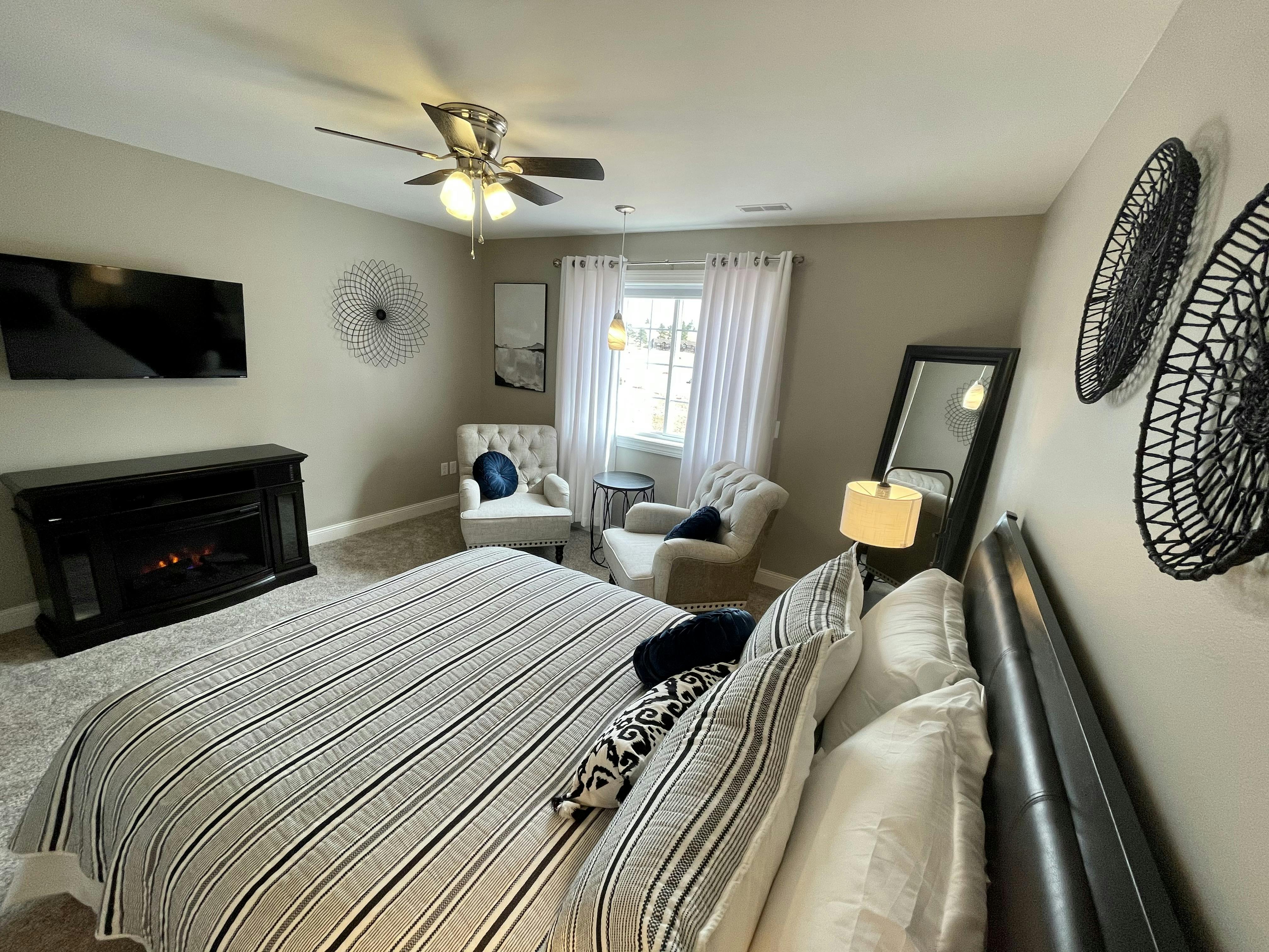 This warm and inviting room for up to 2 guests is accented with blues, blacks and whites and sets the mood with a sense of neutrality and simplicity. Snuggle in and enjoy the glow of the remotely controlled fireplace or watch you favorite satellite TV show on the flat screen TV or catch a movie on Netflix. Its easy to feel right at home with a comfortable queen sized bed and private bathroom. Forget something, nor worries, complimentary shampoo, conditioner and body wash are provided. If you like a little more fluff, extra pillows and blankets are as close as your closet. While our focus is on your comfort, we understand that safety and security is also a must which is why we have a hard wired smoke alarm in your room along with a electronic coded deadbolt system to keep your belongings secure.